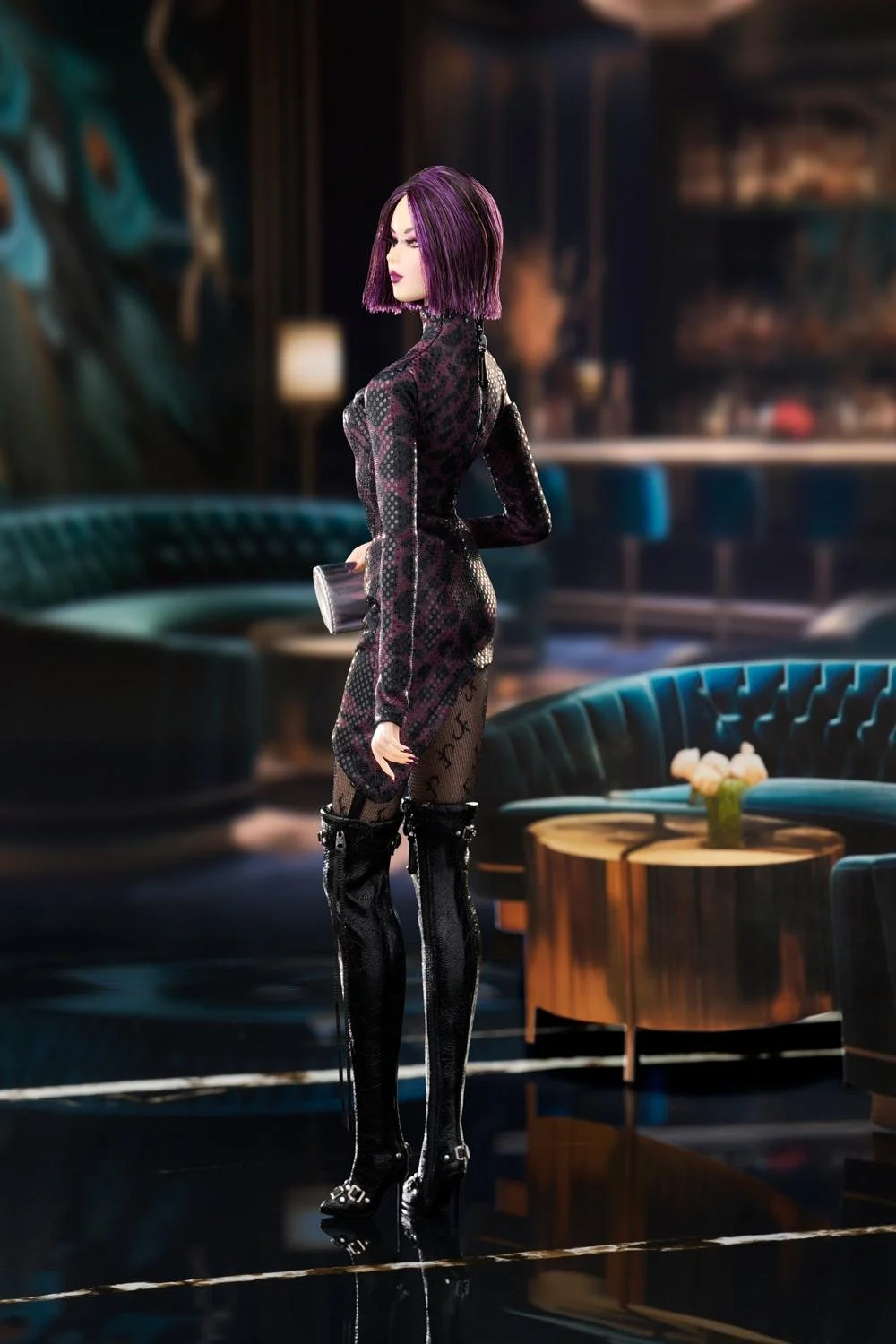 Navia always looks great with a bob and she’s no exception here. Her screening also suites her sculpt so well in this iteration. I love goth style but this is too much purple all at once for me. She could have had different eye shadow and/or lip colours, for example dark blue to match her coat, or even black. The fabric pattern of her dress, as well as the cut, looks more sci-fi than goth, which is not bad but detracts from the style. Love the bag.